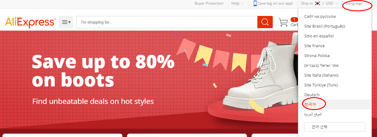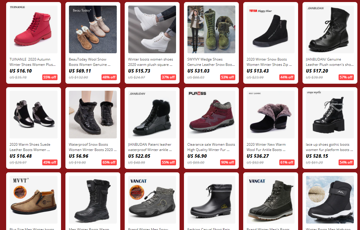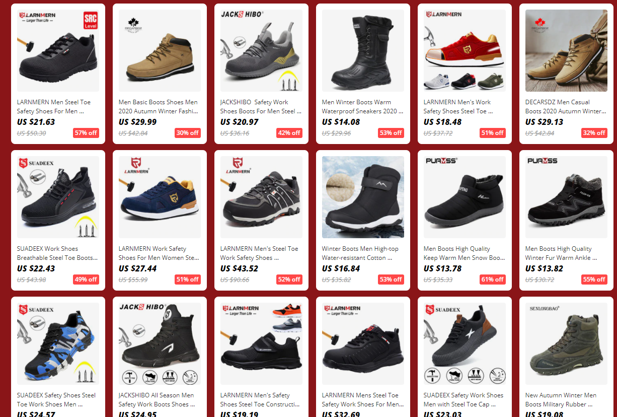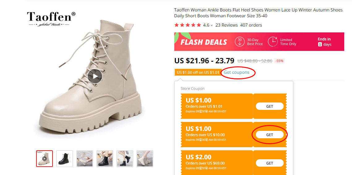 위의 링크가 알리익스프레스 운동화, 부츠 할인을 진행하고 있는 페이지에요.
