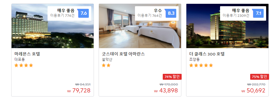 국내 인기 호텔 3곳 소개 : 출처 아고다 AGODA