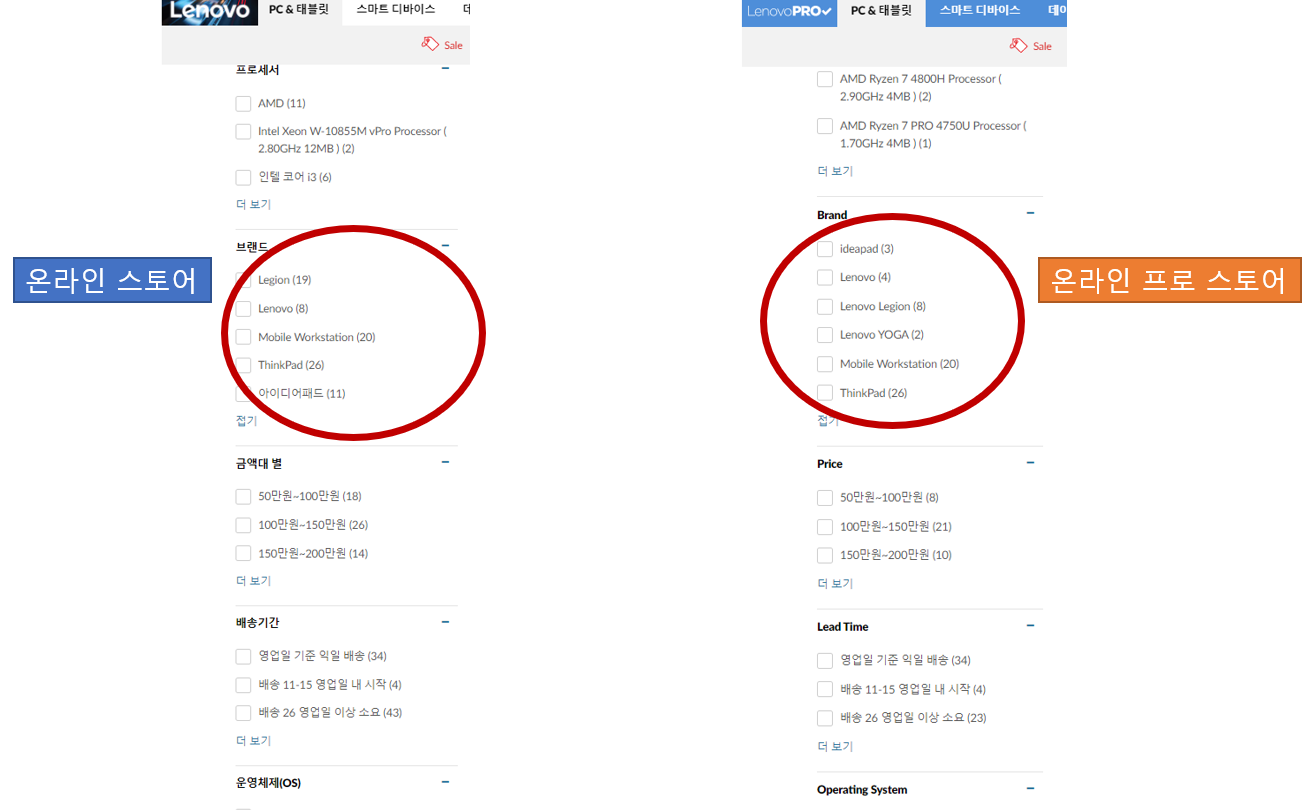 온라인 스토어와 프로 스토어는 모델 명은 같아도 사양을