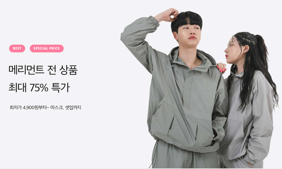 4900원 부터 마스크 , 셋업까지 최대 75% 특가로 만나볼수가 있어요.