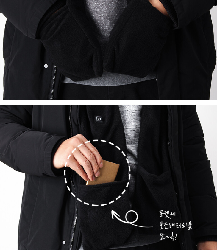 목도리 양끝에 포켓이 있어 보조배터리를 수납하거나 손을 넣어