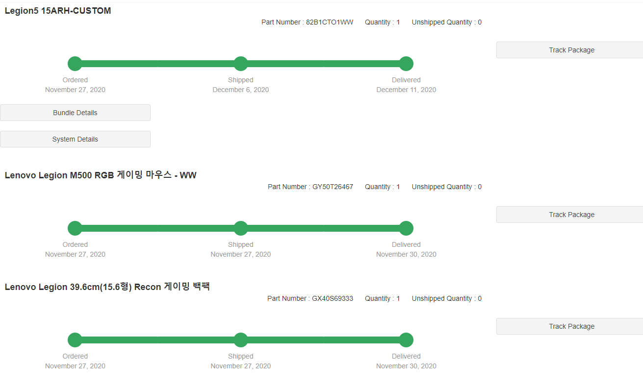 위의 사진에서 보면 27일에 주문해서 백팩과 마우스는 30일에 도착한것으로 나오지만,