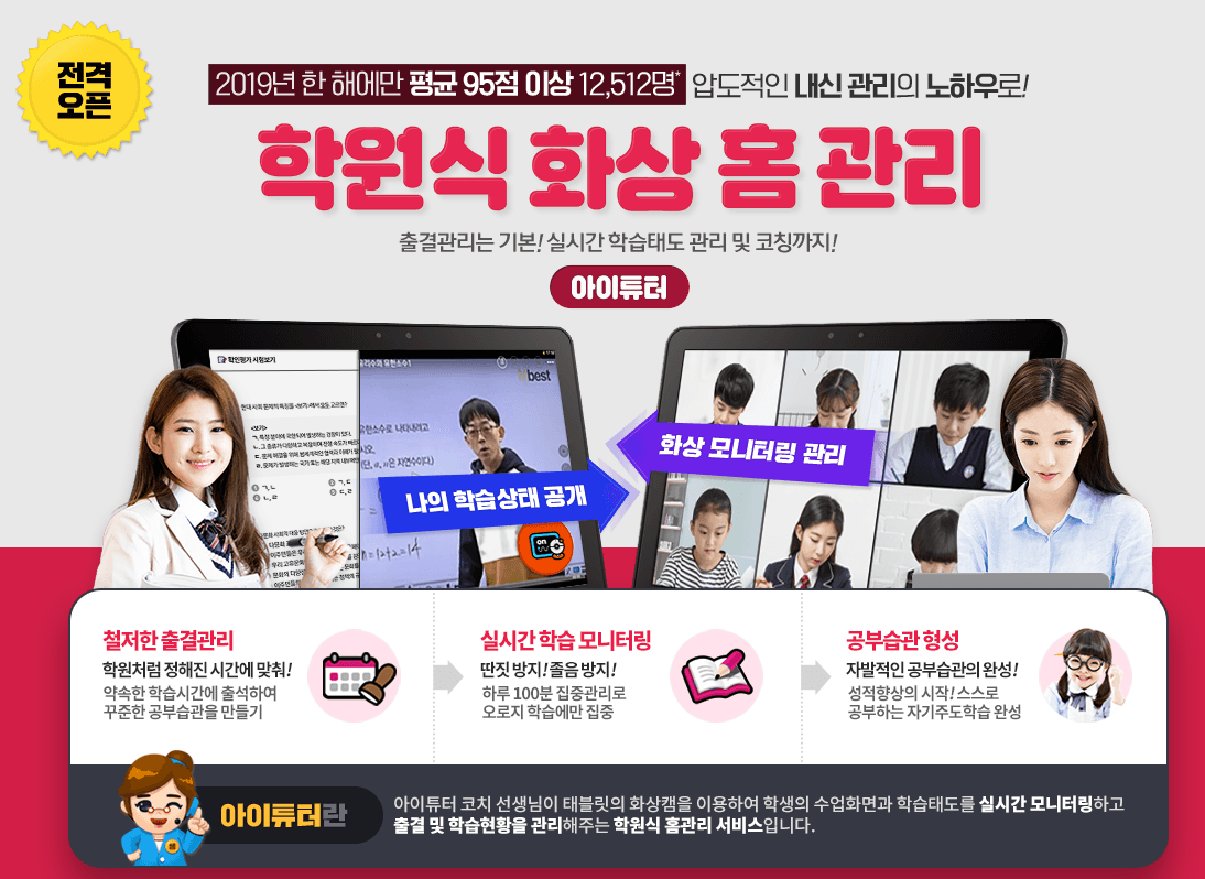학습태도를 실시간 모니터링하고 출결 및 학습현황을 관리해주는 학원식 홈관리 서비스인