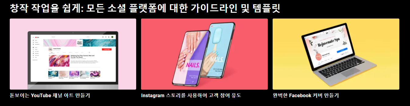 대상 고객이 있는 모든 소셜 미디어 플랫폼에 맞게 크기가 미리 지정된 템플릿을 찾아볼수가 있어요.
