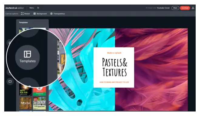 화면 왼쪽의 툴바에있는 "템플릿"아이콘 위에 마우스를 올려 YouTube 채널 아트 템플릿을 찾아보세요. 채널에서 추천하는 동영상의 스타일과 느낌과 일치하는 템플릿을 찾을 때까지 사용 가능한 템플릿을 살펴보세요.