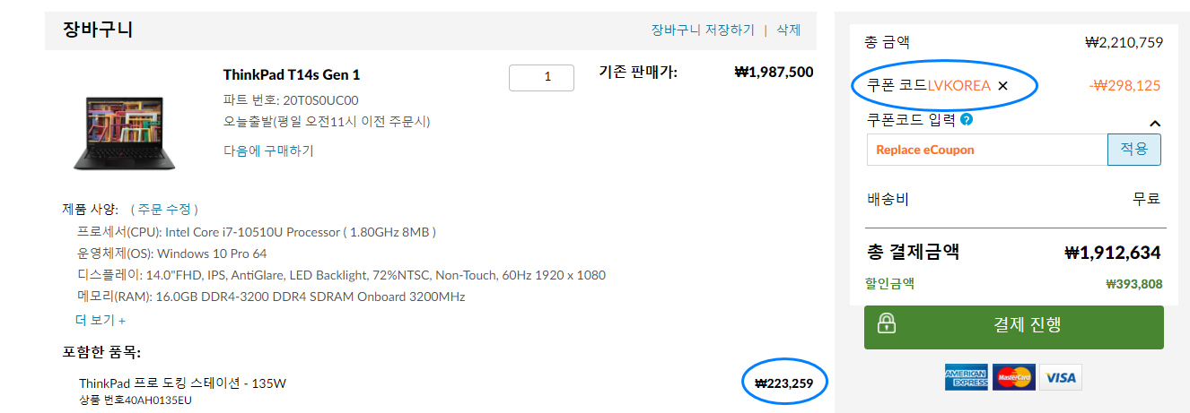 할인코드 사용전 ThinkPad 프로 도킹스테이션 135W 모델의 가격은