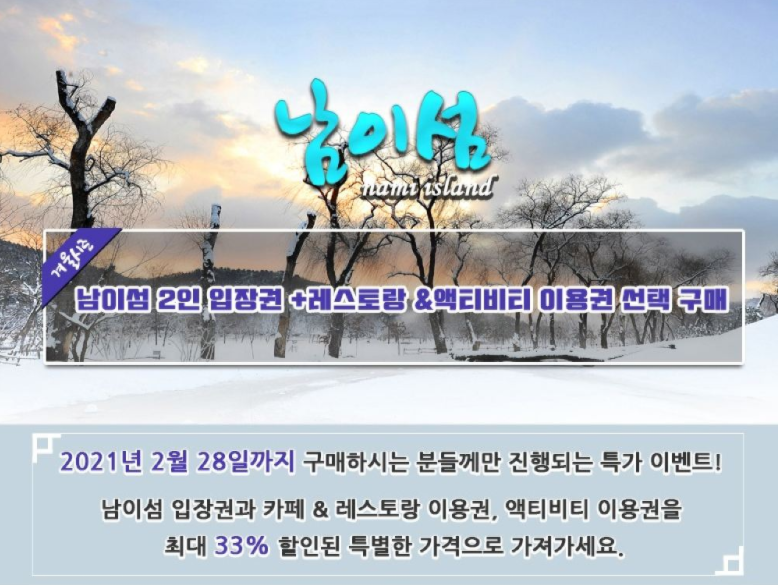 [특가] 남이섬 2인 입장권 + 액티비티 & 레스토랑 이용권