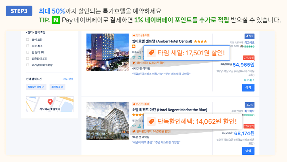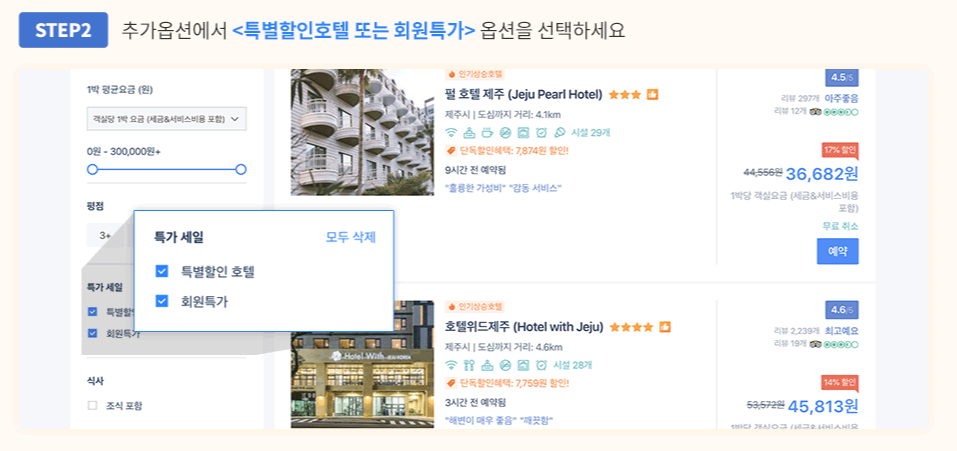 검색결과가 나오면 왼쪽 옵션에서 특별할인 호텔과 회원특가를 체크해보시면
