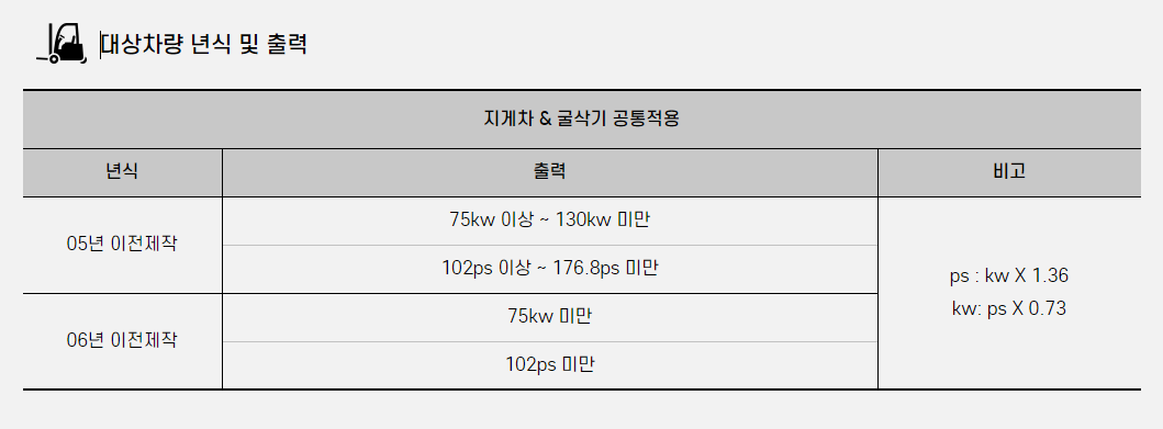 ’04년 이전 제작된 것이나, 엔진출력이 75㎾ 이상 130㎾ 미만은 ’05년 이전 제작,