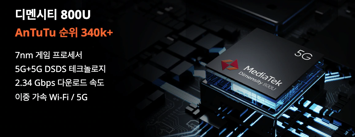 CPU:Dimensity 800U 5G옥타 코어, 최대 2.4GHz