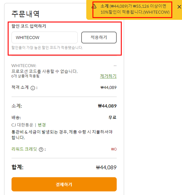 할인코드를 입력하면 할인 된 것을 확인 할 수가 있어요.
