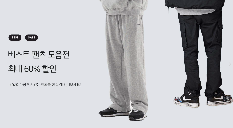 인기 있는 팬츠를 최대 60% 할인을 진행하고 있어요.