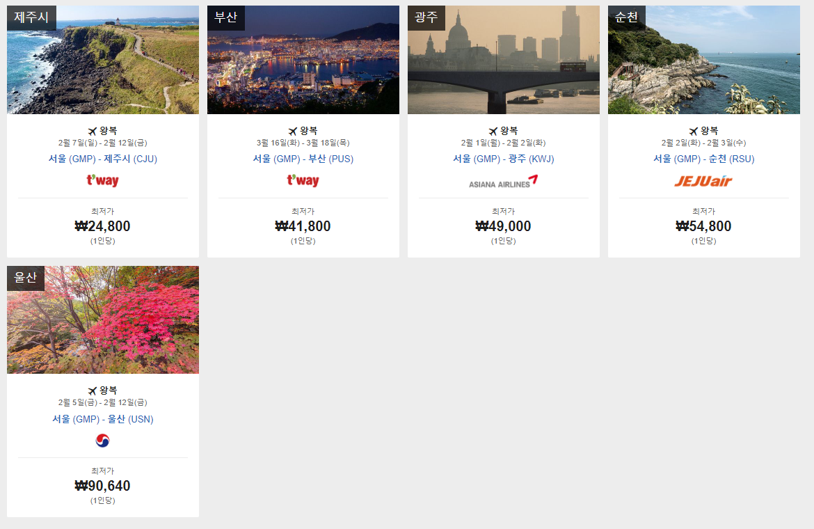 저희의 항공권 검색결과는 여러분이 항공권 예약 시 필요한 모든 정보를 가장 빠르게 보여드립니다. 여러분이 원하시는 해당 일자의 출발지 선택하시고, 그 다음 가격, 기간, 출발시간, 도착시간 등으로 맞춤 필터를 통해 할인 특가 항공권을 자신에게 가장 편한 출발 및 도착시간에 예약하세요.