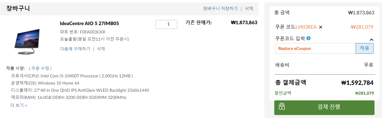 역시 LVKOREA를 적용하니 281,079원 할인을