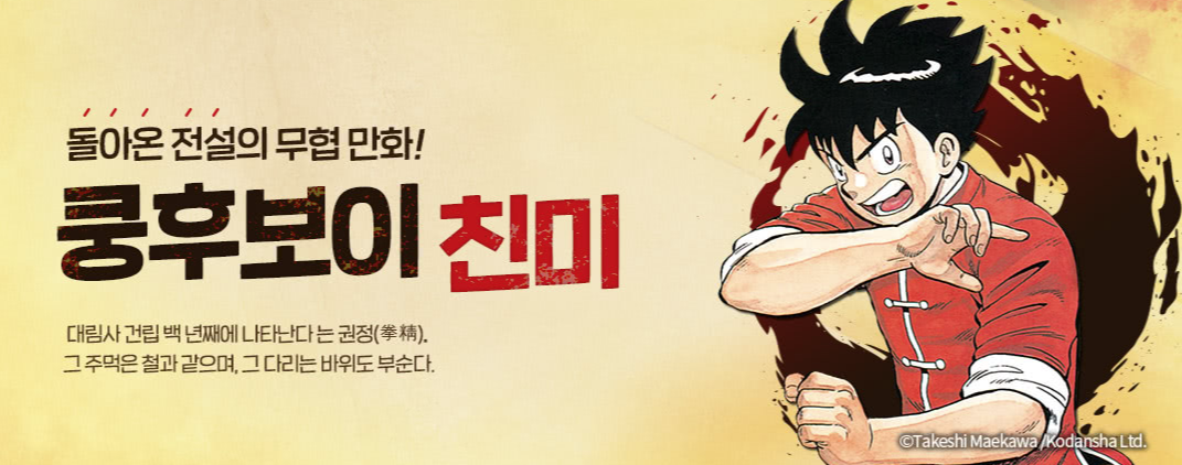 무협글:Takeshi Maekawa / 그림:Takeshi Maekawa전설의 무협 액션 쿵후보이 친미가 오리지널 개정판으로 다시 돌아왔다!! 대림사 건립 백 년째에 나타난다 는 권정(拳精). 그 주먹은 철과 같으며, 그 다리는 바위도 부순다. 중국 사천성 장강의 상류에서 자란 활기찬 쿵후 소년 친미의 끝없이 계속되는 수련 이..