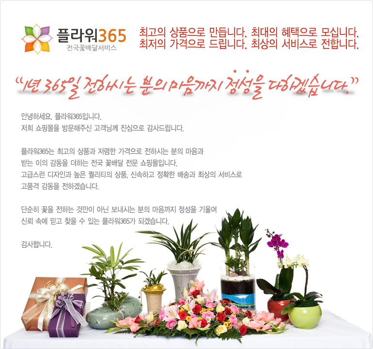 1년 365일 꽃배달 전문 온라인 서비스 / 24시간 고객센터 운영 / 회원가입시 5,000원 적립 / 상품구매시 5% 할인, 10%적립 / 적립금 5만원 이상 현금 교환 / 기업회원 별도 적립율 협의 / 전국 500여개 가맹 화원을 통한 좋은 품질의 상품을 저렴하고 신속하게 배송 / 꽃바구니, 꽃다발, 축하화환, 근조화환, 동서양란, 화분, 분재 등 다양한 상품 구매 가능합니다.