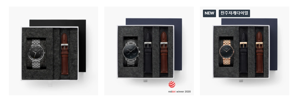 청회색, 실버 혹은 로즈 골드 케이스, 하얀색, 감청색 혹은 블랙 다이얼, 그리고 갈색 및 연한 회색의 비건 가죽 줄 중에서 선택할 수 있습니다. 다른 디자인처럼 스테인리스 스틸 메쉬나 나일론 메쉬 줄 중에서 선택할 수 있습니다.