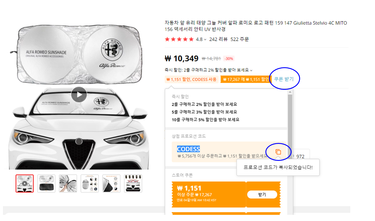 상품상세페이지로 이동을 하면 오른쪽에 쿠폰받기 클릭하시고,