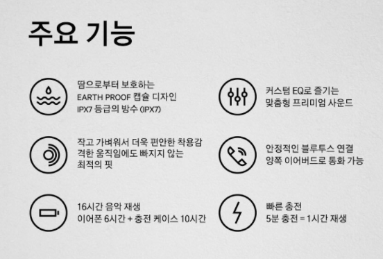 16시간의 음악 재생시간, IPX7의 완벽한 방수등급, 더 작아진