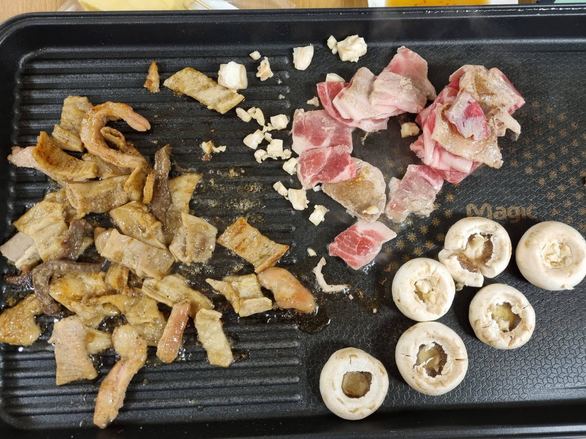 왼쪽에 같이 구워지고 있는 것은 소모둠 곱창이에요.