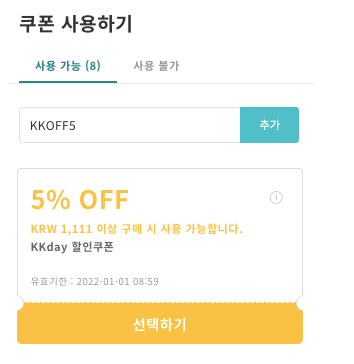 KKOFF5 를 입력하여 추가로 5% 쿠폰을 사용할 수 있습니다.