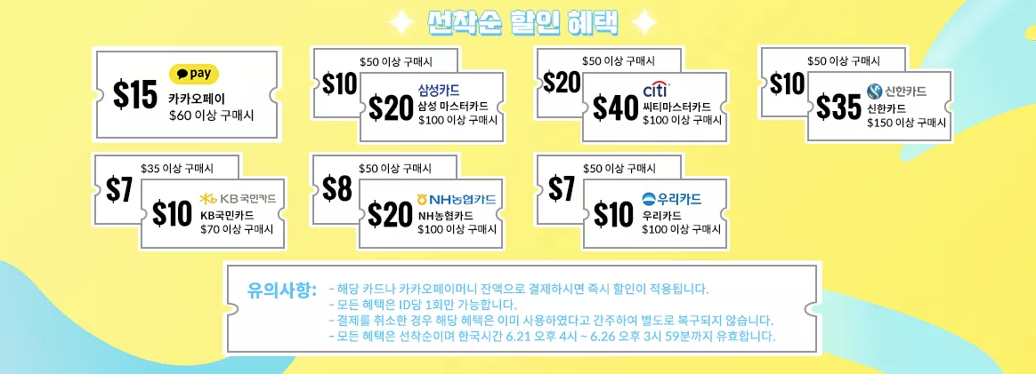 카카오페이 : 60달러 이상 구매시 15$ 할인