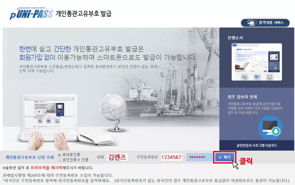 거기서 자신의 성명과 주민번호를 입력하고 클릭~!