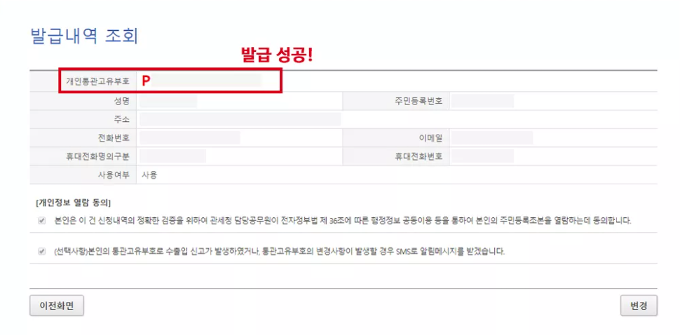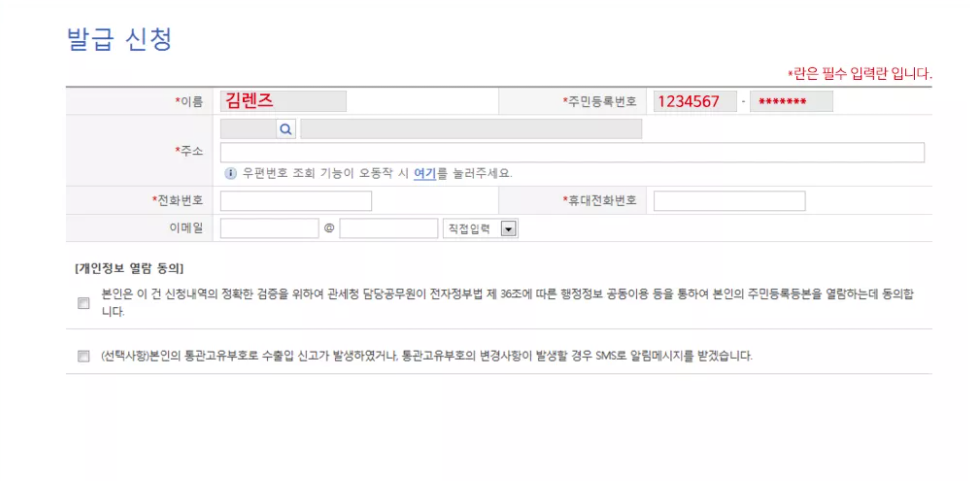 통관절차 중 수입신고서 기재 시, 주민번호 등 개인정보의 유출을 방지하기 위한