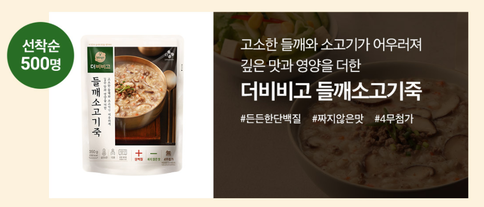 기획전 기간 동안 더비비고 들깨소고기죽을 함께 드리고 있어요.