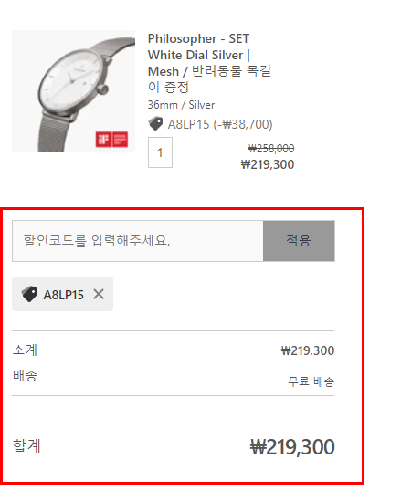 - 최종 결제페이지에서 할인코드 입력 후 적용하면 할인 금액으로 계산됩니다.