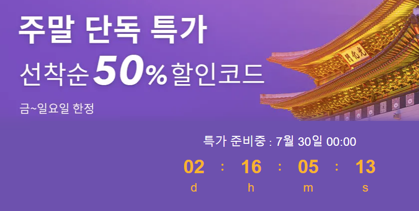 1. 특가 예약기간 : 7~8월 중 매주 금,토,일 (매주 금요일 자정 특가 노출)