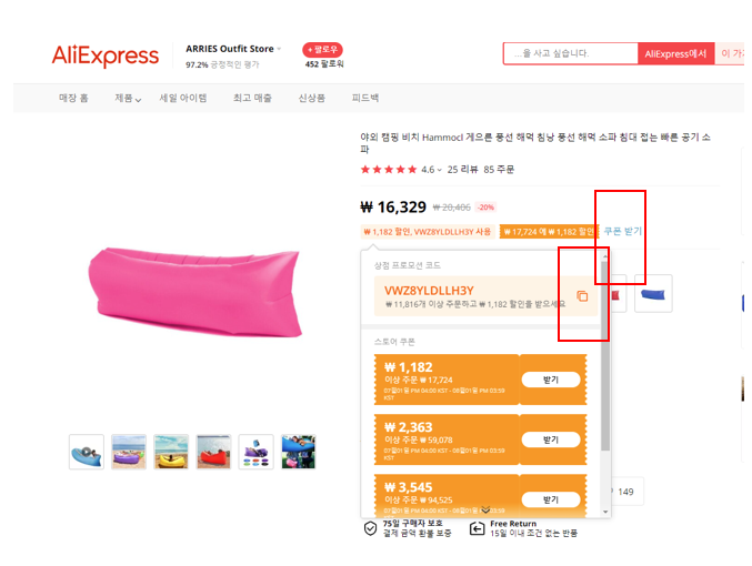 알리익스프레스 프로모션쿠폰 코드 8월 : 공기주입식 야외용 해먹 포스팅은 제휴마케팅이
