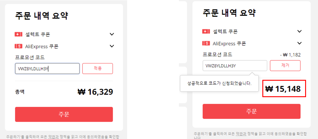 적용을 클릭하시면 할인을 받을 수가 있어요.