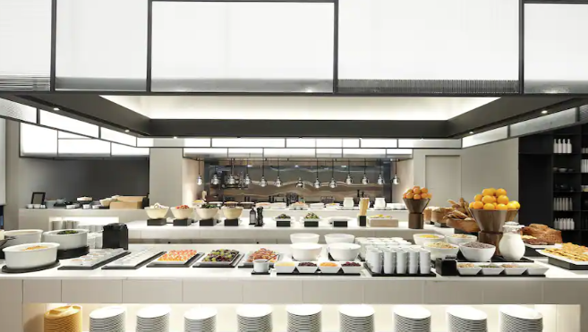 뷔페 아침 식사를 성인은 KRW 25000, 어린이는 KRW 15000의 별도 요금(대략적인 금액)으로 제공