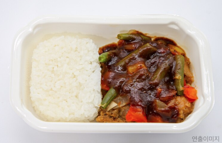 밥, 닭갈비 그리고 매콤함을 잡아 줄 야채까지 하나의 용기에 담겨 있어요.