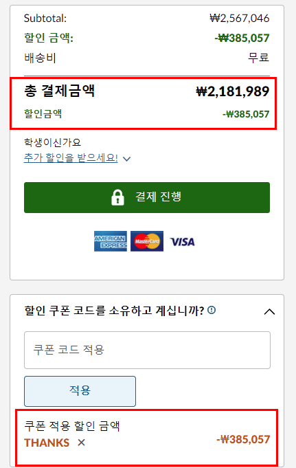 하지만 하단에 할인쿠폰코드를 사용합니다를 클릭해보세요.