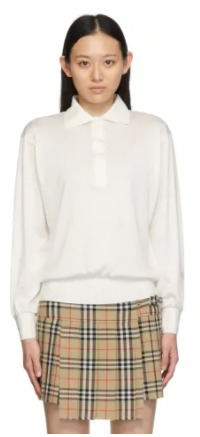 화이트 색상의 실크 저지 소재 폴로 셔츠. 긴소매. 브랜드 색상: Ivory