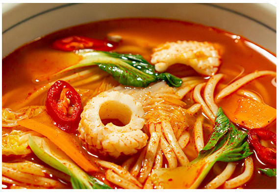 식감이 살아있는 오징어, 청경채, 표고버섯 고명이 들어있어요.