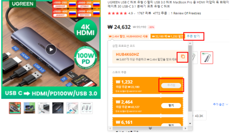 그럼 이상으로 윈도우 노트북 맥북에 사용가능한 HDMI USB C 허브 할인 프로모션코드 알리익스프레스 직구