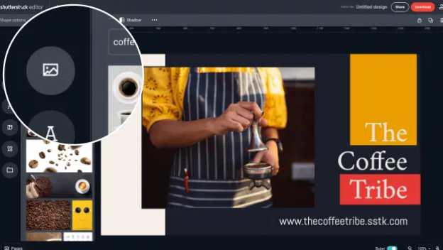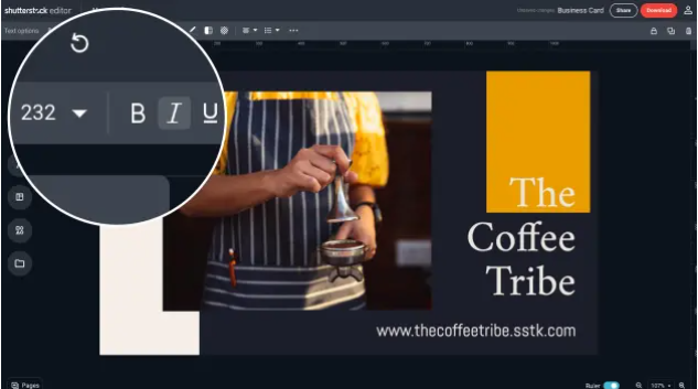 툴바 상단에 있는 검색 아이콘으로 Shutterstock 라이브러리를 찾아보세요. 라이브러리에서 이미지를 선택하여 명함의 배경으로 사용하거나 이미지를 전경 요소로 포함하여 명함을 돋보이게 만들 수 있습니다.