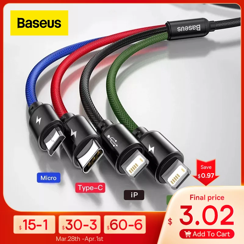 Baseus 3 in 1 USB Cable Type C Cable for Samsung S20 Xiaomi Mi 9 Cable for iPhone 12 X 11 Pro Max Huawei Charger Micro USB Cable