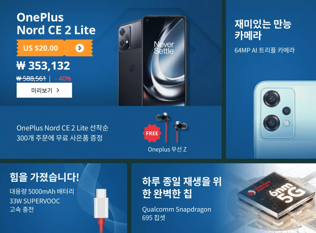 OnePlus Nord CE 2 Lite 금어초 695 5G 스마트 폰 8GB 128GB 휴대 전화 33W 빠른 충전 120Hz 디스플레이 안드로이드