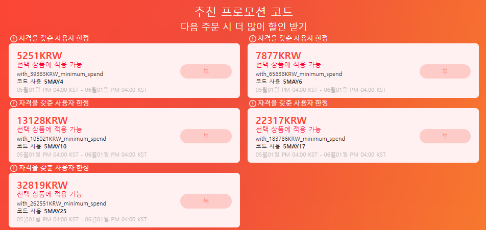 5월 프로모션코드는 금액대별로 사용할 수 있는 코드가 달라요.