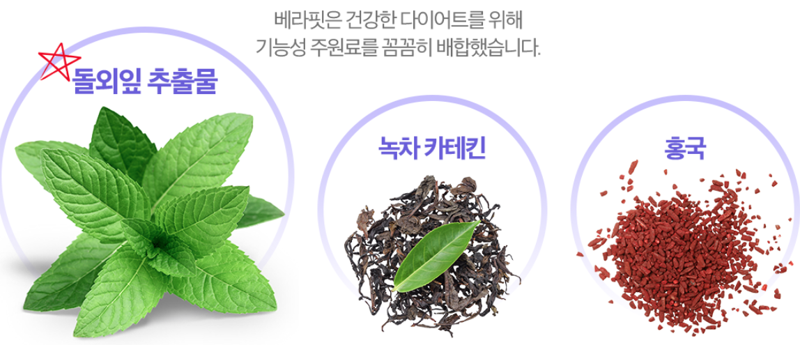 베라핏은 돌외잎 추출물 외에도 녹차 카테킨, 홍국 등