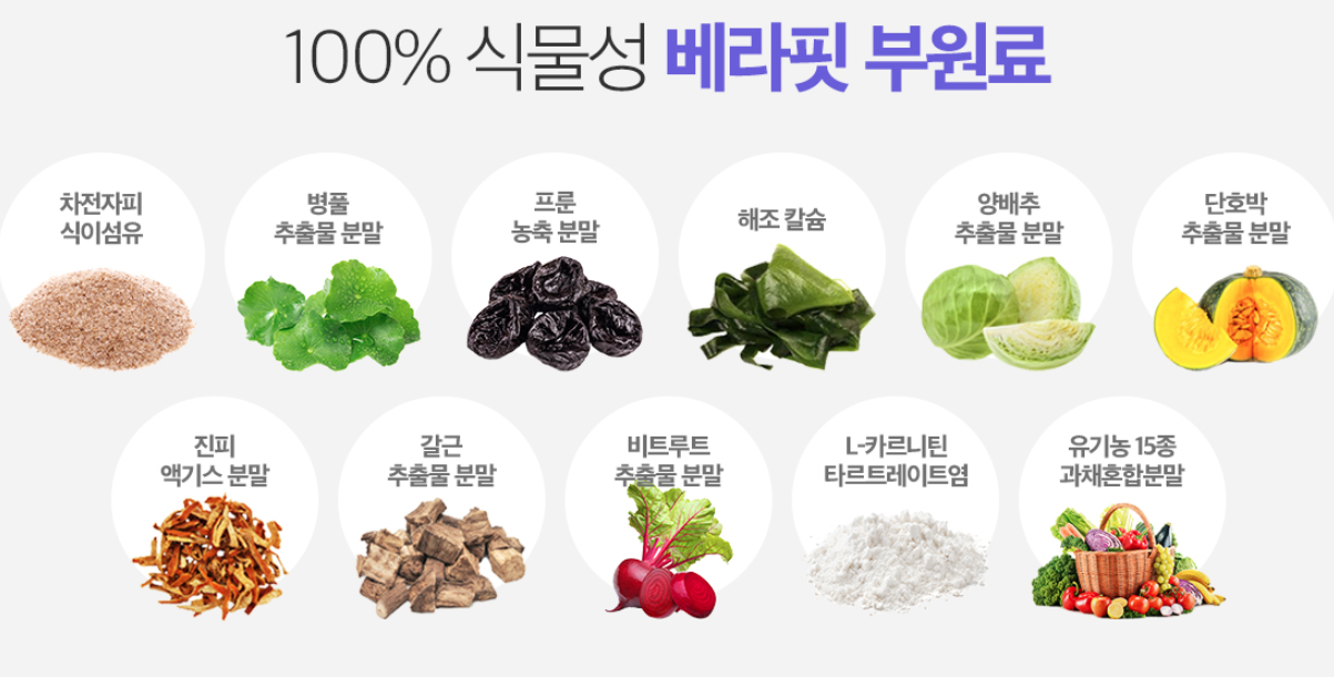 이 밖에도 7+15 등 다양한 부원료로 성분에 대한 자신감을 베라핏 입니다.