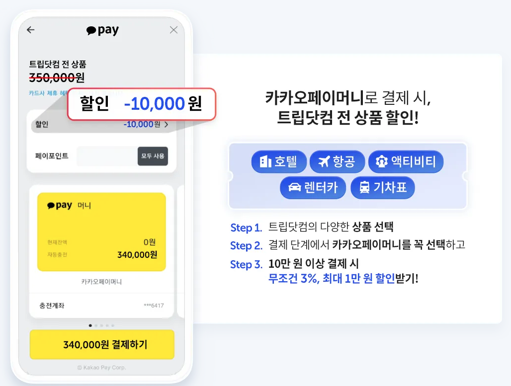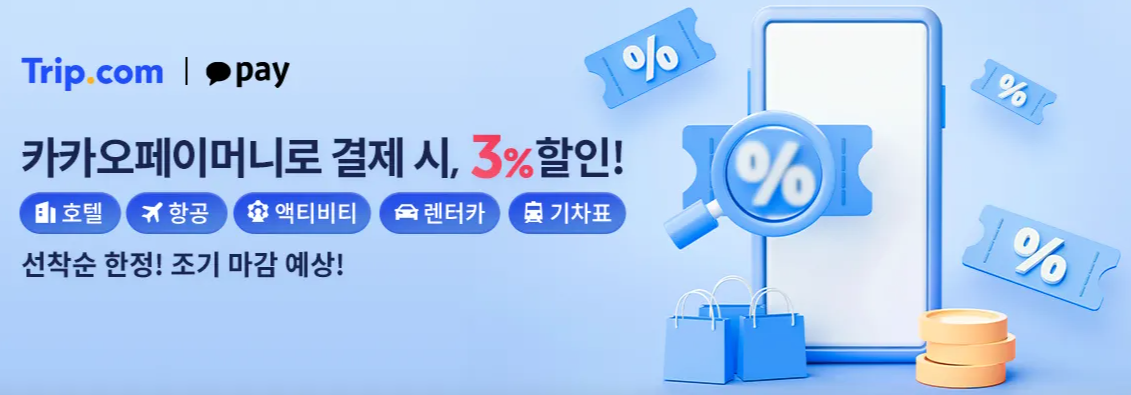월 한달 간 카카오페이머니로 호텔, 항공 등 트립닷컴 전 상품 결제 시 3% 할인 프로모션