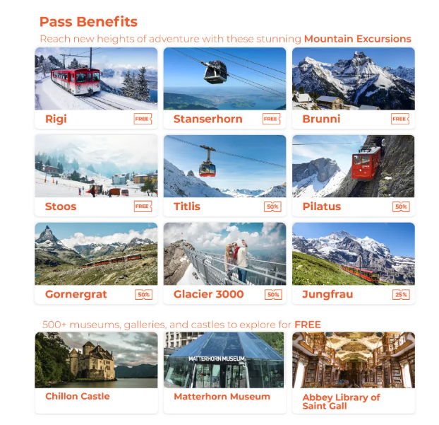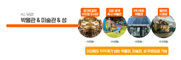 500개 이상의 박물관에 무료로 입장할 수 있고, 스위스 융프라우 체험시 최대 50% 할인을 받을 수 있어요!
