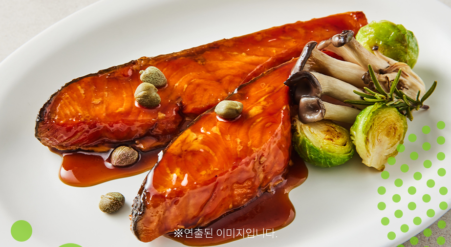 훈연향 가득한 연어에 애플데리야끼 소스를 마리네이드했어요.