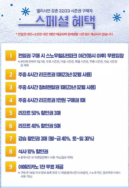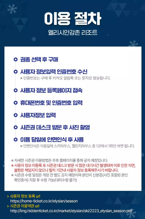 그럼 이상으로 리프트권 엘리시안 강촌 22/23 시즌권 + 장비렌탈 바우처 할인쿠폰 포스팅을 마치겠습니다.