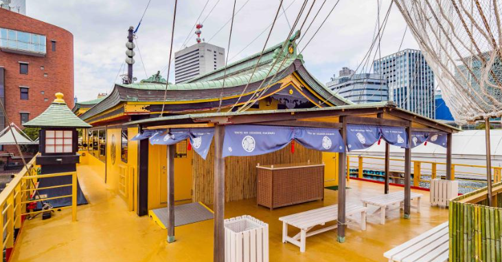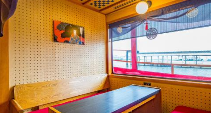 고베항에 우뚝 선 주홍색의 일본식 배 고자부네 아타케 마루(정원 500명)는 에도 막부의 3대 쇼군 이에미쓰의 명령으로 건조된 거대한 배 아타케 마루에서 영감을 받았습니다. 오카야마 태생의 산업 디자이너 미토오카 에이지 씨 감수하에 2017년에 리뉴얼 하였습니다. 전 좌석이 모두 자유석으로 배의 내부는 만다라와 같은 다양한 연령대와 문화의 스타일을 다채롭게 꾸민 미닫이 문 그림, 일본 우산, 천장 그림과 결합하여 고급스럽고 우아한 공간을 연출했습니다.